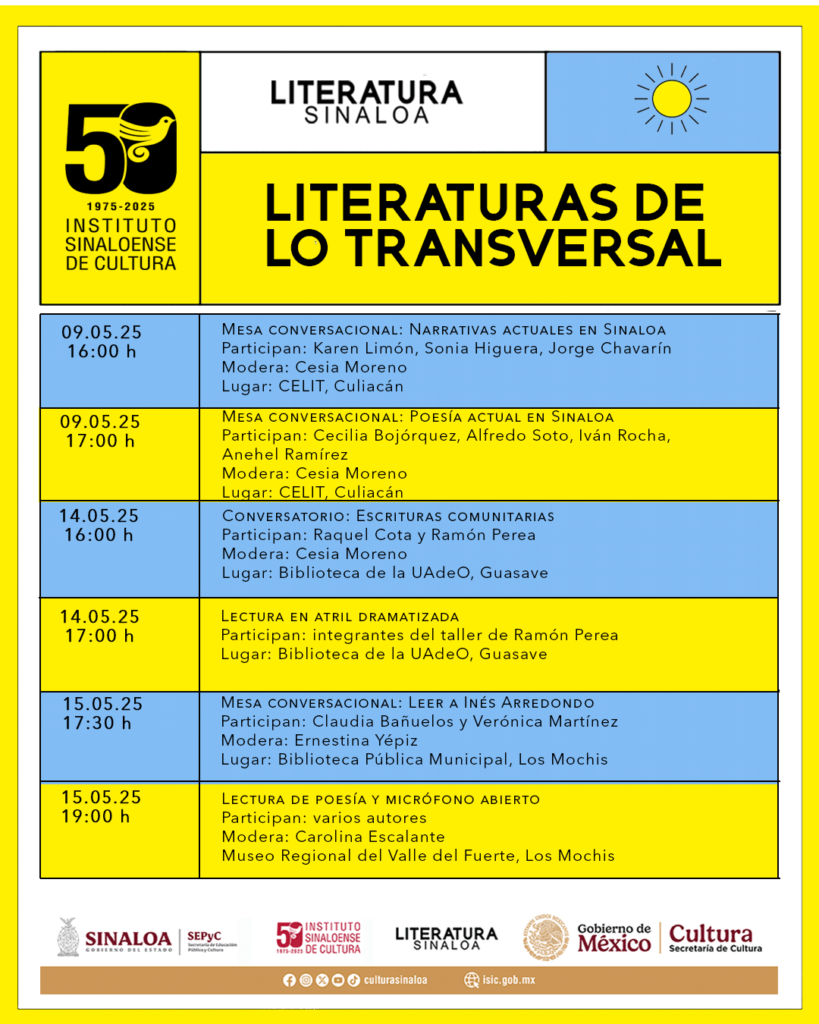 Este 2025 el Instituto Sinaloense de Cultura (antiguo Difocur) está conmemorando sus cincuenta años de existencia y en el área de literatura y editorial, nos hemos planteado hacer un ejercicio de lo transversal y crear un espacio —lecturas comunitarias y mesas conversacionales— para la reflexión y el diálogo en torno a la poesía, la literatura, la creación artística, la cultura, las políticas culturales y los derechos humanos en Sinaloa.